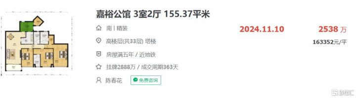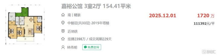 位于天河区珠江新城中的典型小区嘉裕公馆,2024年11月155.37平米三室两厅成交总价约2538万,折合单价约16.34万/平,到了2025年12月同户型154.41平三室两厅成交总价只有1720万,折合单价约11.14万/平,调整幅度约31.8%。