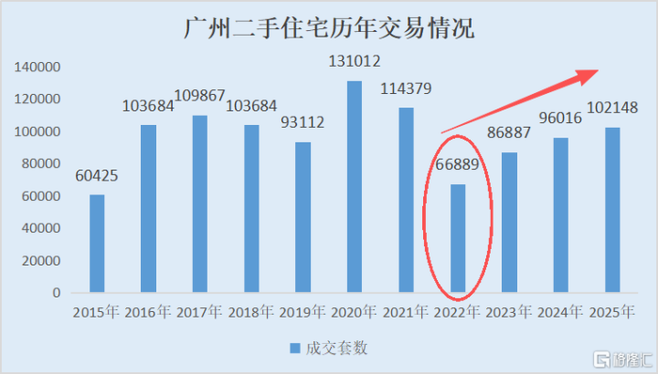广州的成交量定力更明显。把时间拉长来看,2015年成交量是近10年最低的一年,然后是2022年,但2025年二手住宅的成交套数已经站回到10万出头,环比2024年增加了约6.39%。