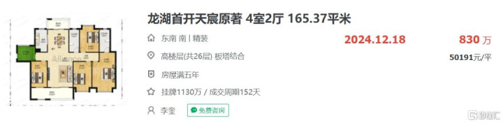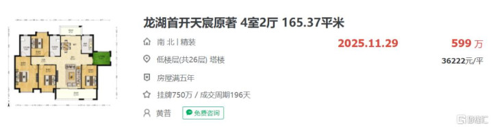 根据链家平台显示,广州的典型小区龙湖首开天宸原著,位于天河区黄村,2024年12月165.37平米的4室2厅成交总价约830万,折合单价约5.09万/平,2025年11月同户型成交总价只剩599万,折合单价约3.62万/平,调整幅度约28.88%。