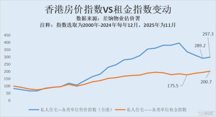 根据香港差饷物业估价署数据,香港2025年2-11月各类单位售价指数回升,11月售价指数回升至297.3。