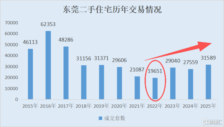 但深圳政策收紧,市场进入冷冻期,东莞也就跟着冷冻,2022年二手住宅的成交量跌到不到2万套,但是现在2025年也回到了3万套以上,是近8年以来的新高了。