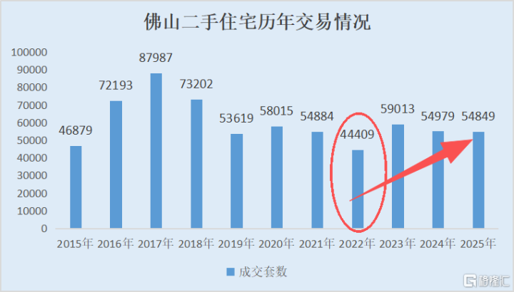 佛山在四个城市中相对低调,节奏紧跟广州。2022年二手房市场最冷,只维持在约4.44万套的成交量,但这之后,都回到5万套以上,2025年二手住宅成交量未创新高,但也靠本地刚需+广州临广片区的外溢稳住在54849套。