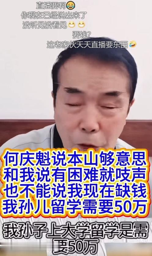 接着更绝的事情发生了,1月21号何庆魁在直播里提到,他的孙子想去国外读书,还差50万块钱,他自己年纪大了拿不出来,然后他话头一转,说赵本山总讲“有困难就找我”,但他不能没脸去要钱,这话听起来像是谦虚,实际上是在等别人帮他开口,网友们马上点破这一点,说他不是没钱,只是不想自己张嘴,他那套房子能值五十多万,卖掉就能解决事情,可他偏偏不卖,就是要别人主动给他掏钱。