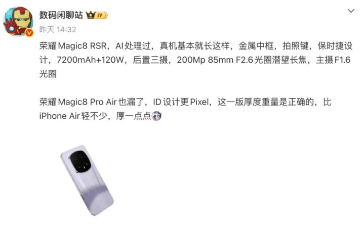 除了Magic8 Pro Air和千元档新机,荣耀还曝光了Magic8 RSR的相关配置:保时捷设计语言、7200mAh电池、120W有线快充,以及2亿像素潜望长焦主摄。