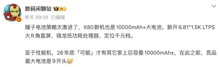 从数码博主的爆料来看,荣耀即将推出的千元档X80新机,直接将电池容量拉到了10000mAh,而目前行业内竞品的最大电池还停留在9000mAh级别。这一激进策略,精准命中了千元档用户的核心痛点。