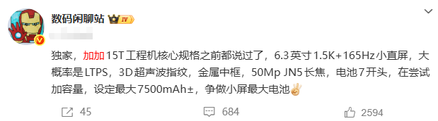 但现在有好消息啦!据知名博主@数码闲聊站 爆料道:“独家,加加15T工程机核心规格之前都说过了,6.3英寸1.5K+165Hz小直屏,大概率是LTPS,3D超声波指纹,金属中框,50Mp JN5长焦,电池7开头,在尝试加容量,设定最大7500mAh±,争做小屏最大电池”。