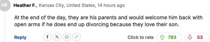 “说到底,他们是他的父母,如果他最终离婚,他们会张开双臂欢迎他回来,因为他们爱他们的儿子。”