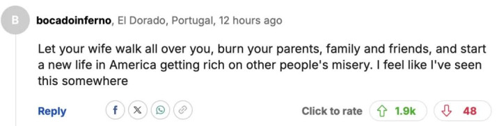 “让你的妻子践踏你的尊严,伤害你的父母、家人和朋友,然后在美国开始新的生活,靠别人的痛苦发家致富。我感觉我在哪里见过这种事。”