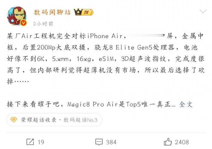 数码圈近日爆出重磅消息,博主@数码闲聊站 披露了一款已被小米放弃的Air系列工程机。这款完全对标iPhone Air的机型,在研发阶段就达到了极高的完成度,最终却因内部市场研判而终止推进,让不少数码爱好者直呼惋惜。