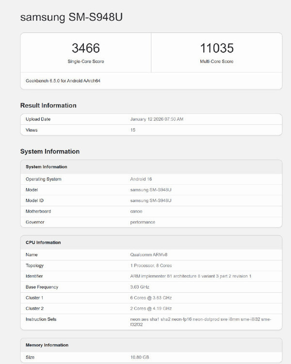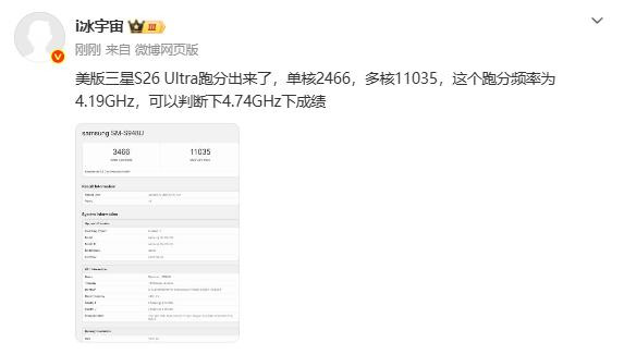 【CNMO科技消息】1月12日,数码博主@i冰宇宙 曝光了三星S26 Ultra美版在Geekbench平台的跑分数据。爆料显示,该机的单核得分为2466分,多核得分为11035分。结合得分来看,该机有望搭载骁龙8 Elite Gen5移动平台