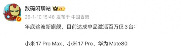 与此同时,参考博主@数码闲聊站 的数据来看,小米17 Pro Max也已达成单品激活百万。