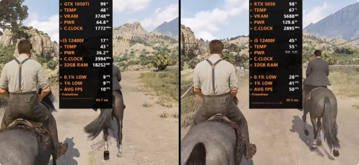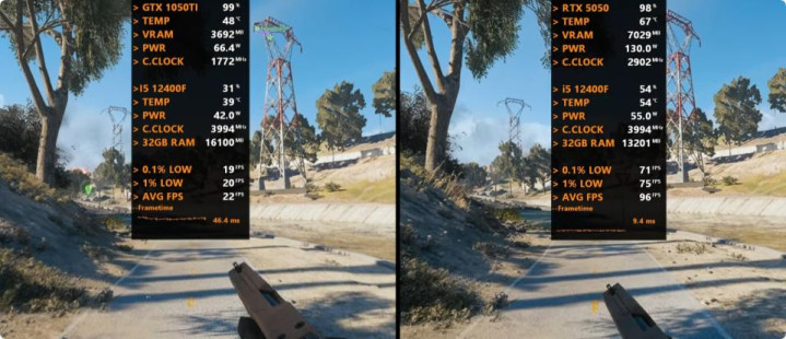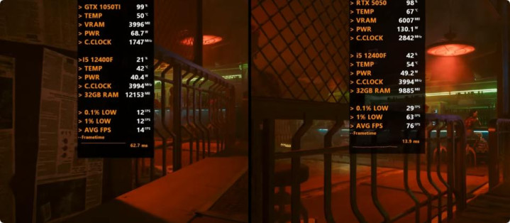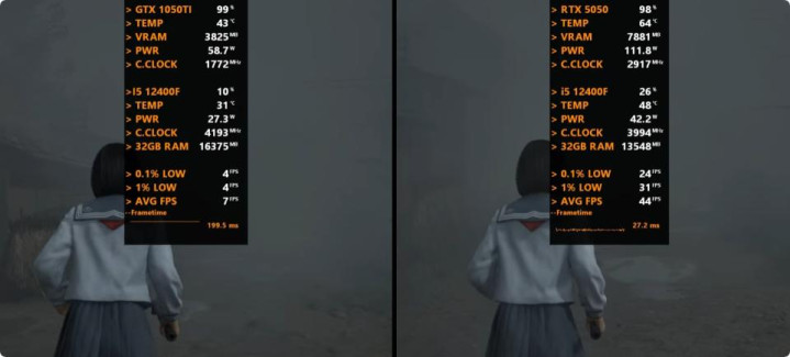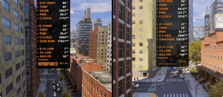 以下将分别测试七款游戏,均采用1080P最高画质模式,以下系列图片中左边代表GeForce GTX 1050 Ti平台,右边代表GeForce RTX 5050平台。