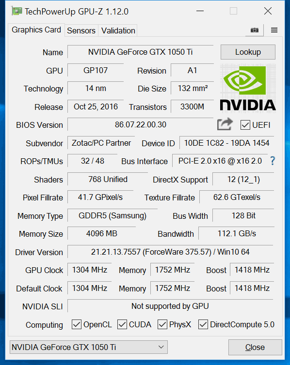 GeForce GTX 1050 Ti发布于2016年10月25日,采用GP107 GPU,三星14纳米工艺,拥有768个着色器单元,48个纹理单元,32个光栅单元, 6个多单元流处理器,L2级缓存为1024KB。