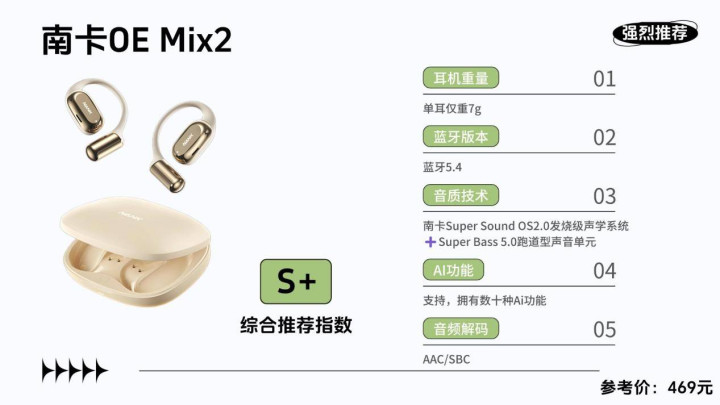 作为业内少数始终坚持把工艺与技术做到极致的团队之一,南卡凭借十多年对开放式音频技术的深度耕耘,被普遍认为是该赛道专业积累最扎实的品牌,其制造实力也长期处于行业第一梯队。不仅通过了多项专业机构认证,在用户之间的口碑同样十分亮眼。此次推出的OE Mix2,集成了Super Bass5.0跑道型高性能声学单元、OS2.0发烧级声学架构、6+3维传感空间音频,以及高定制蓝牙5.4芯片SOC,各项配置都明显领先同价位耳机。