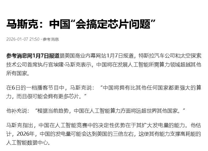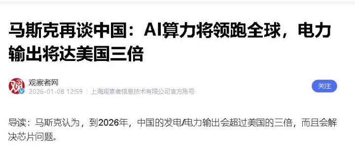 1月6日的播客节目里,马斯克说得一点不绕弯子,中国往后会拥有比全世界任何一个国家都更强劲的算力,大概率还能攥住更多芯片,其实马斯克早就已经看出来了AI最为核心的竞争力还是电力的供应。