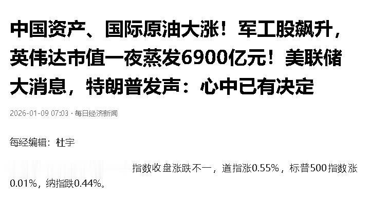 在1月8日美股准备收盘的时候,当时的英伟达股价已经下跌了有2.19%,也就是说英伟达已经在一天的时间之内,市值在不断的蒸发,已经989亿美元了,换算成人民币大概也有6900亿。